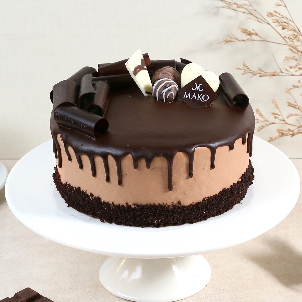 Moist chocolate cake filled with layers of chocolate ganache. A favorite for chocolate lovers.