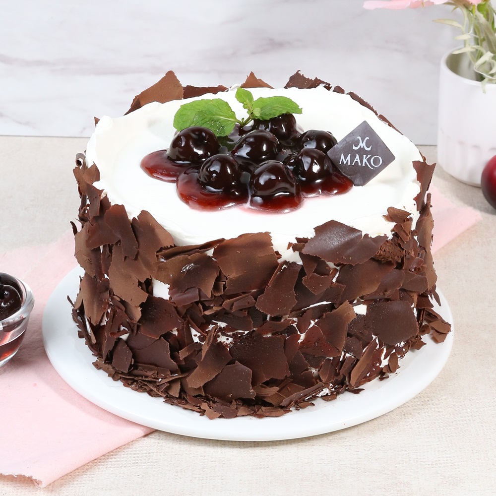 Chocolate sponge cake with rich cherry and chocolate cream filling, with chocolate shavings and dark cherries.